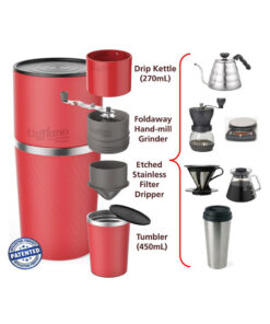 Esta cafetera puramente diseñada para ser portátil es la única todo en uno: símil pava con vertedor de precisión, molinillo, dripper y vaso con tapa. Con su método de filtrado por goteo podés preparar un fresco café de la misma manera que una Chemex o una V60, sin perder el aroma, la fragancia y el sabor de sus granos, logrando una infusión balanceada y de cuerpo firme.